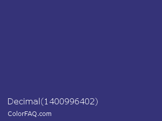 Decimal 1400996402 Color is a normal indigo color and the nearest color is Minsk #3f307f. Hex code #353378 and RGB value is rgb(53,51,120). In RGB color space, this color is composed of 21% red, 20% green, 47% blue, In CMYK color space, this color is composed of 56% cyan, 58% magenta, 0% yellow , 53% black , In HSL color space, this color has a hue angle of 242° , 40% saturation and 34% lightness.