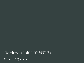 Decimal 1401036823 Color is a dark cyan color and the nearest color is Cape Cod #3c4443. Hex code #354241 and RGB value is rgb(53,66,65). In RGB color space, this color is composed of 21% red, 26% green, 25% blue, In CMYK color space, this color is composed of 20% cyan, 0% magenta, 2% yellow , 74% black , In HSL color space, this color has a hue angle of 175° , 11% saturation and 23% lightness.
