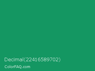 Decimal 22416589702 Color is a normal green color and the nearest color is Green Cyan #009966. Hex code #149762 and RGB value is rgb(20,151,98). In RGB color space, this color is composed of 8% red, 59% green, 38% blue, In CMYK color space, this color is composed of 87% cyan, 0% magenta, 35% yellow , 41% black , In HSL color space, this color has a hue angle of 156° , 77% saturation and 34% lightness.