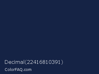 Decimal 22416810391 Color is a very dark blue color and the nearest color is Bunting #151f4c. Hex code #152345 and RGB value is rgb(21,35,69). In RGB color space, this color is composed of 8% red, 14% green, 27% blue, In CMYK color space, this color is composed of 70% cyan, 49% magenta, 0% yellow , 73% black , In HSL color space, this color has a hue angle of 223° , 53% saturation and 18% lightness.