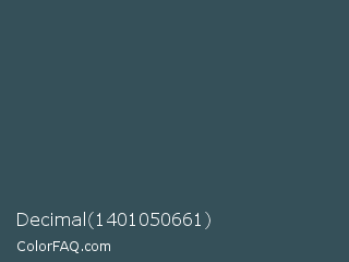 Decimal 1401050661 Color is a dark blue color and the nearest color is Dark Slate Gray #2f4f4f. Hex code #355059 and RGB value is rgb(53,80,89). In RGB color space, this color is composed of 21% red, 31% green, 35% blue, In CMYK color space, this color is composed of 40% cyan, 10% magenta, 0% yellow , 65% black , In HSL color space, this color has a hue angle of 195° , 25% saturation and 28% lightness.