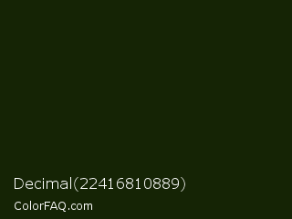 Decimal 22416810889 Color is a almost black green color and the nearest color is Pine Tree #171f04. Hex code #152405 and RGB value is rgb(21,36,5). In RGB color space, this color is composed of 8% red, 14% green, 2% blue, In CMYK color space, this color is composed of 42% cyan, 0% magenta, 86% yellow , 86% black , In HSL color space, this color has a hue angle of 89° , 76% saturation and 8% lightness.
