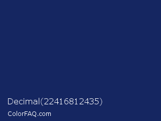 Decimal 22416812435 Color is a dark blue color and the nearest color is Biscay #1b3162. Hex code #152661 and RGB value is rgb(21,38,97). In RGB color space, this color is composed of 8% red, 15% green, 38% blue, In CMYK color space, this color is composed of 78% cyan, 61% magenta, 0% yellow , 62% black , In HSL color space, this color has a hue angle of 227° , 64% saturation and 23% lightness.