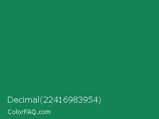Decimal 22416983954 Color is a dark green color and the nearest color is Deep Green Cyan Turquoise #0e7c61. Hex code #158358 and RGB value is rgb(21,131,88). In RGB color space, this color is composed of 8% red, 51% green, 35% blue, In CMYK color space, this color is composed of 84% cyan, 0% magenta, 33% yellow , 49% black , In HSL color space, this color has a hue angle of 157° , 72% saturation and 30% lightness.