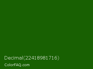 Decimal 22418981716 Color is a very dark green color and the nearest color is Lincoln Green #195905. Hex code #186002 and RGB value is rgb(24,96,2). In RGB color space, this color is composed of 9% red, 38% green, 1% blue, In CMYK color space, this color is composed of 75% cyan, 0% magenta, 98% yellow , 62% black , In HSL color space, this color has a hue angle of 106° , 96% saturation and 19% lightness.