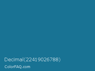 Decimal 22419026788 Color is a normal blue color and the nearest color is Matisse #1b659d. Hex code #187394 and RGB value is rgb(24,115,148). In RGB color space, this color is composed of 9% red, 45% green, 58% blue, In CMYK color space, this color is composed of 84% cyan, 22% magenta, 0% yellow , 42% black , In HSL color space, this color has a hue angle of 196° , 72% saturation and 34% lightness.