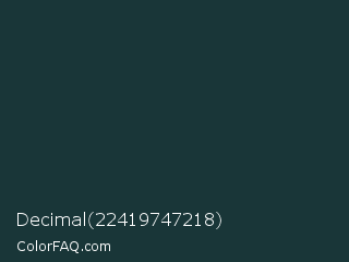 Decimal 22419747218 Color is a very dark cyan color and the nearest color is Gable Green #163531. Hex code #193638 and RGB value is rgb(25,54,56). In RGB color space, this color is composed of 10% red, 21% green, 22% blue, In CMYK color space, this color is composed of 55% cyan, 4% magenta, 0% yellow , 78% black , In HSL color space, this color has a hue angle of 184° , 38% saturation and 16% lightness.