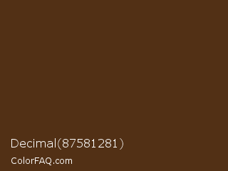 Decimal 87581281 Color is a very dark orange color and the nearest color is Jambalaya #5b3013. Hex code #523015 and RGB value is rgb(82,48,21). In RGB color space, this color is composed of 32% red, 19% green, 8% blue, In CMYK color space, this color is composed of 0% cyan, 41% magenta, 74% yellow , 68% black , In HSL color space, this color has a hue angle of 27° , 59% saturation and 20% lightness.
