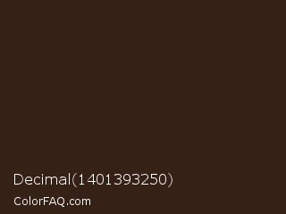 Decimal 1401393250 Color is a very dark orange color and the nearest color is Eclipse #311c17. Hex code #362116 and RGB value is rgb(54,33,22). In RGB color space, this color is composed of 21% red, 13% green, 9% blue, In CMYK color space, this color is composed of 0% cyan, 39% magenta, 59% yellow , 79% black , In HSL color space, this color has a hue angle of 21° , 42% saturation and 15% lightness.