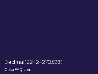 Decimal 22424273528 Color is a very dark indigo color and the nearest color is Port Gore #251f4f. Hex code #201846 and RGB value is rgb(32,24,70). In RGB color space, this color is composed of 13% red, 9% green, 27% blue, In CMYK color space, this color is composed of 54% cyan, 66% magenta, 0% yellow , 73% black , In HSL color space, this color has a hue angle of 250° , 49% saturation and 18% lightness.
