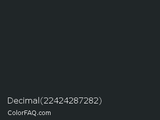 Decimal 22424287282 Color is a very dark blue color and the nearest color is Dark Gunmetal #1f262a. Hex code #202628 and RGB value is rgb(32,38,40). In RGB color space, this color is composed of 13% red, 15% green, 16% blue, In CMYK color space, this color is composed of 20% cyan, 5% magenta, 0% yellow , 84% black , In HSL color space, this color has a hue angle of 195° , 11% saturation and 14% lightness.