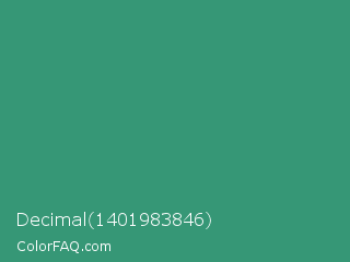 Decimal 1401983846 Color is a normal green color and the nearest color is Illuminating Emerald #319177. Hex code #369776 and RGB value is rgb(54,151,118). In RGB color space, this color is composed of 21% red, 59% green, 46% blue, In CMYK color space, this color is composed of 64% cyan, 0% magenta, 22% yellow , 41% black , In HSL color space, this color has a hue angle of 160° , 47% saturation and 40% lightness.