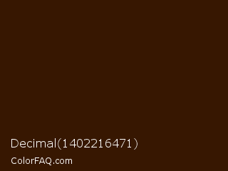 Decimal 1402216471 Color is a very dark orange color and the nearest color is Rebel #3c1206. Hex code #371701 and RGB value is rgb(55,23,1). In RGB color space, this color is composed of 22% red, 9% green, 0% blue, In CMYK color space, this color is composed of 0% cyan, 58% magenta, 98% yellow , 78% black , In HSL color space, this color has a hue angle of 24° , 96% saturation and 11% lightness.