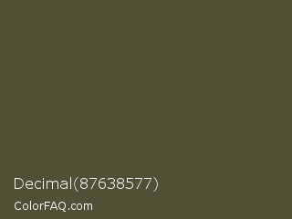 Decimal 87638577 Color is a dark yellow color and the nearest color is Judge Gray #544333. Hex code #524f37 and RGB value is rgb(82,79,55). In RGB color space, this color is composed of 32% red, 31% green, 22% blue, In CMYK color space, this color is composed of 0% cyan, 4% magenta, 33% yellow , 68% black , In HSL color space, this color has a hue angle of 53° , 20% saturation and 27% lightness.
