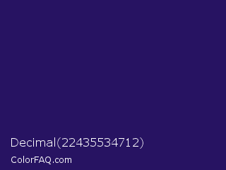 Decimal 22435534712 Color is a dark indigo color and the nearest color is Violent Violet #290c5e. Hex code #271362 and RGB value is rgb(39,19,98). In RGB color space, this color is composed of 15% red, 7% green, 38% blue, In CMYK color space, this color is composed of 60% cyan, 81% magenta, 0% yellow , 62% black , In HSL color space, this color has a hue angle of 255° , 68% saturation and 23% lightness.