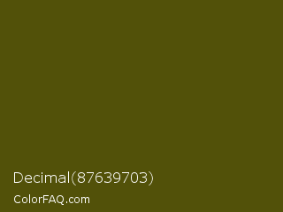 Decimal 87639703 Color is a very dark yellow color and the nearest color is Saratoga #555b10. Hex code #525109 and RGB value is rgb(82,81,9). In RGB color space, this color is composed of 32% red, 32% green, 4% blue, In CMYK color space, this color is composed of 0% cyan, 1% magenta, 89% yellow , 68% black , In HSL color space, this color has a hue angle of 59° , 80% saturation and 18% lightness.