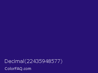 Decimal 22435948577 Color is a dark indigo color and the nearest color is Deep Blue #220878. Hex code #281175 and RGB value is rgb(40,17,117). In RGB color space, this color is composed of 16% red, 7% green, 46% blue, In CMYK color space, this color is composed of 66% cyan, 85% magenta, 0% yellow , 54% black , In HSL color space, this color has a hue angle of 254° , 75% saturation and 26% lightness.