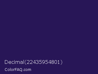 Decimal 22435954801 Color is a very dark indigo color and the nearest color is Valhalla #2b194f. Hex code #281657 and RGB value is rgb(40,22,87). In RGB color space, this color is composed of 16% red, 9% green, 34% blue, In CMYK color space, this color is composed of 54% cyan, 75% magenta, 0% yellow , 66% black , In HSL color space, this color has a hue angle of 257° , 60% saturation and 21% lightness.
