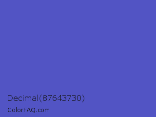 Decimal 87643730 Color is a normal blue color and the nearest color is Iris #5a4fcf. Hex code #5254c4 and RGB value is rgb(82,84,196). In RGB color space, this color is composed of 32% red, 33% green, 77% blue, In CMYK color space, this color is composed of 58% cyan, 57% magenta, 0% yellow , 23% black , In HSL color space, this color has a hue angle of 239° , 49% saturation and 55% lightness.