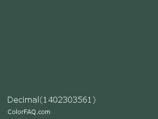 Decimal 1402303561 Color is a dark green color and the nearest color is Dark Slate Gray #2f4f4f. Hex code #375349 and RGB value is rgb(55,83,73). In RGB color space, this color is composed of 22% red, 33% green, 29% blue, In CMYK color space, this color is composed of 34% cyan, 0% magenta, 12% yellow , 67% black , In HSL color space, this color has a hue angle of 159° , 20% saturation and 27% lightness.