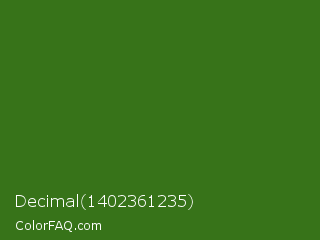Decimal 1402361235 Color is a dark green color and the nearest color is Bilbao #327c14. Hex code #377319 and RGB value is rgb(55,115,25). In RGB color space, this color is composed of 22% red, 45% green, 10% blue, In CMYK color space, this color is composed of 52% cyan, 0% magenta, 78% yellow , 55% black , In HSL color space, this color has a hue angle of 100° , 64% saturation and 27% lightness.