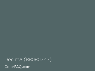 Decimal 88080743 Color is a normal cyan color and the nearest color is Stormcloud #4f666a. Hex code #526667 and RGB value is rgb(82,102,103). In RGB color space, this color is composed of 32% red, 40% green, 40% blue, In CMYK color space, this color is composed of 20% cyan, 1% magenta, 0% yellow , 60% black , In HSL color space, this color has a hue angle of 183° , 11% saturation and 36% lightness.