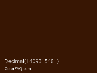Decimal 1409315481 Color is a very dark orange color and the nearest color is Rebel #3c1206. Hex code #381603 and RGB value is rgb(56,22,3). In RGB color space, this color is composed of 22% red, 9% green, 1% blue, In CMYK color space, this color is composed of 0% cyan, 61% magenta, 95% yellow , 78% black , In HSL color space, this color has a hue angle of 22° , 90% saturation and 12% lightness.