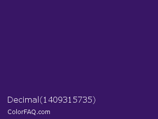 Decimal 1409315735 Color is a dark violet color and the nearest color is Scarlet Gum #431560. Hex code #381665 and RGB value is rgb(56,22,101). In RGB color space, this color is composed of 22% red, 9% green, 40% blue, In CMYK color space, this color is composed of 45% cyan, 78% magenta, 0% yellow , 60% black , In HSL color space, this color has a hue angle of 266° , 64% saturation and 24% lightness.