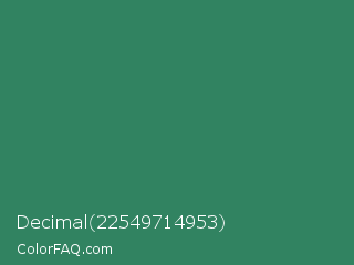 Decimal 22549714953 Color is a normal green color and the nearest color is Sea Green #2e8b57. Hex code #318361 and RGB value is rgb(49,131,97). In RGB color space, this color is composed of 19% red, 51% green, 38% blue, In CMYK color space, this color is composed of 63% cyan, 0% magenta, 26% yellow , 49% black , In HSL color space, this color has a hue angle of 155° , 46% saturation and 35% lightness.