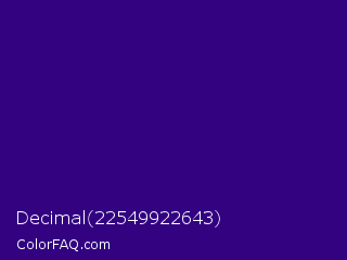 Decimal 22549922643 Color is a dark violet color and the nearest color is Kingfisher Daisy #3e0480. Hex code #320281 and RGB value is rgb(50,2,129). In RGB color space, this color is composed of 20% red, 1% green, 51% blue, In CMYK color space, this color is composed of 61% cyan, 98% magenta, 0% yellow , 49% black , In HSL color space, this color has a hue angle of 263° , 97% saturation and 26% lightness.