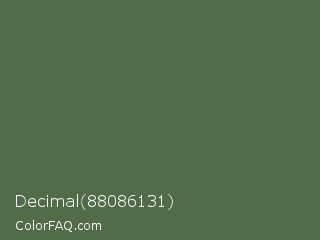 Decimal 88086131 Color is a normal green color and the nearest color is Axolotl #4e6649. Hex code #526c49 and RGB value is rgb(82,108,73). In RGB color space, this color is composed of 32% red, 42% green, 29% blue, In CMYK color space, this color is composed of 24% cyan, 0% magenta, 32% yellow , 58% black , In HSL color space, this color has a hue angle of 105° , 19% saturation and 35% lightness.