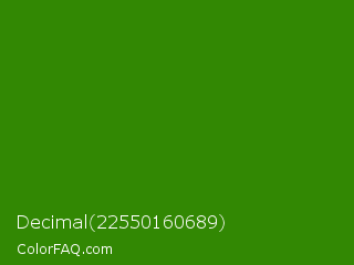 Decimal 22550160689 Color is a dark green color and the nearest color is Napier Green #2a8000. Hex code #328803 and RGB value is rgb(50,136,3). In RGB color space, this color is composed of 20% red, 53% green, 1% blue, In CMYK color space, this color is composed of 63% cyan, 0% magenta, 98% yellow , 47% black , In HSL color space, this color has a hue angle of 99° , 96% saturation and 27% lightness.