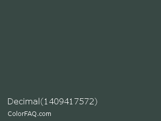 Decimal 1409417572 Color is a dark cyan color and the nearest color is Cape Cod #3c4443. Hex code #384844 and RGB value is rgb(56,72,68). In RGB color space, this color is composed of 22% red, 28% green, 27% blue, In CMYK color space, this color is composed of 22% cyan, 0% magenta, 6% yellow , 72% black , In HSL color space, this color has a hue angle of 165° , 13% saturation and 25% lightness.