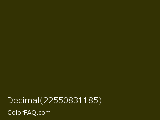 Decimal 22550831185 Color is a very dark yellow color and the nearest color is Madras #3f3002. Hex code #333203 and RGB value is rgb(51,50,3). In RGB color space, this color is composed of 20% red, 20% green, 1% blue, In CMYK color space, this color is composed of 0% cyan, 2% magenta, 94% yellow , 80% black , In HSL color space, this color has a hue angle of 59° , 89% saturation and 11% lightness.