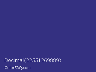Decimal 22551269889 Color is a normal indigo color and the nearest color is Cosmic Cobalt #2e2d88. Hex code #343081 and RGB value is rgb(52,48,129). In RGB color space, this color is composed of 20% red, 19% green, 51% blue, In CMYK color space, this color is composed of 60% cyan, 63% magenta, 0% yellow , 49% black , In HSL color space, this color has a hue angle of 243° , 46% saturation and 35% lightness.