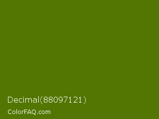 Decimal 88097121 Color is a dark lime color and the nearest color is Avocado #568203. Hex code #527601 and RGB value is rgb(82,118,1). In RGB color space, this color is composed of 32% red, 46% green, 0% blue, In CMYK color space, this color is composed of 31% cyan, 0% magenta, 99% yellow , 54% black , In HSL color space, this color has a hue angle of 78° , 98% saturation and 23% lightness.