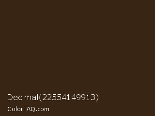 Decimal 22554149913 Color is a very dark orange color and the nearest color is Sambuca #3a2010. Hex code #382513 and RGB value is rgb(56,37,19). In RGB color space, this color is composed of 22% red, 15% green, 7% blue, In CMYK color space, this color is composed of 0% cyan, 34% magenta, 66% yellow , 78% black , In HSL color space, this color has a hue angle of 29° , 49% saturation and 15% lightness.