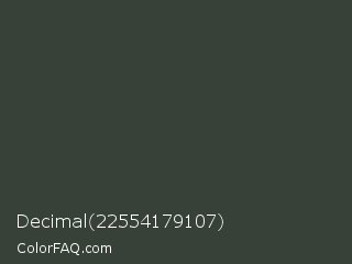 Decimal 22554179107 Color is a dark green color and the nearest color is Black Olive #3b3c36. Hex code #384137 and RGB value is rgb(56,65,55). In RGB color space, this color is composed of 22% red, 25% green, 22% blue, In CMYK color space, this color is composed of 14% cyan, 0% magenta, 15% yellow , 75% black , In HSL color space, this color has a hue angle of 114° , 8% saturation and 24% lightness.
