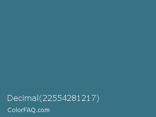Decimal 22554281217 Color is a normal blue color and the nearest color is Teal Blue #367588. Hex code #387385 and RGB value is rgb(56,115,133). In RGB color space, this color is composed of 22% red, 45% green, 52% blue, In CMYK color space, this color is composed of 58% cyan, 14% magenta, 0% yellow , 48% black , In HSL color space, this color has a hue angle of 194° , 41% saturation and 37% lightness.