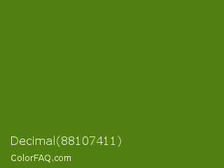 Decimal 88107411 Color is a dark green color and the nearest color is Avocado #568203. Hex code #528111 and RGB value is rgb(82,129,17). In RGB color space, this color is composed of 32% red, 51% green, 7% blue, In CMYK color space, this color is composed of 36% cyan, 0% magenta, 87% yellow , 49% black , In HSL color space, this color has a hue angle of 85° , 77% saturation and 29% lightness.
