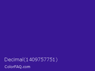 Decimal 1409757751 Color is a normal indigo color and the nearest color is Pixie Powder #391285. Hex code #391795 and RGB value is rgb(57,23,149). In RGB color space, this color is composed of 22% red, 9% green, 58% blue, In CMYK color space, this color is composed of 62% cyan, 85% magenta, 0% yellow , 42% black , In HSL color space, this color has a hue angle of 256° , 73% saturation and 34% lightness.