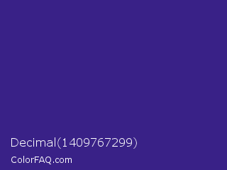 Decimal 1409767299 Color is a normal indigo color and the nearest color is Pixie Powder #391285. Hex code #392187 and RGB value is rgb(57,33,135). In RGB color space, this color is composed of 22% red, 13% green, 53% blue, In CMYK color space, this color is composed of 58% cyan, 76% magenta, 0% yellow , 47% black , In HSL color space, this color has a hue angle of 254° , 61% saturation and 33% lightness.