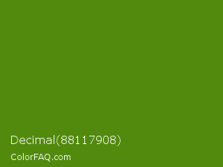 Decimal 88117908 Color is a dark green color and the nearest color is Vida Loca #549019. Hex code #528a0e and RGB value is rgb(82,138,14). In RGB color space, this color is composed of 32% red, 54% green, 5% blue, In CMYK color space, this color is composed of 41% cyan, 0% magenta, 90% yellow , 46% black , In HSL color space, this color has a hue angle of 87° , 82% saturation and 30% lightness.
