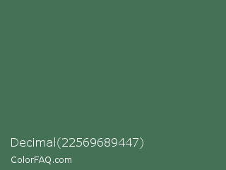 Decimal 22569689447 Color is a normal green color and the nearest color is Amazon #3b7a57. Hex code #457257 and RGB value is rgb(69,114,87). In RGB color space, this color is composed of 27% red, 45% green, 34% blue, In CMYK color space, this color is composed of 39% cyan, 0% magenta, 24% yellow , 55% black , In HSL color space, this color has a hue angle of 144° , 25% saturation and 36% lightness.