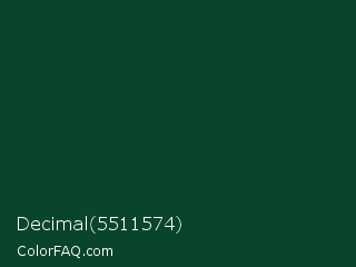 Decimal 5511574 Color is a very dark green color and the nearest color is Sherwood Green #02402c. Hex code #08452c and RGB value is rgb(8,69,44). In RGB color space, this color is composed of 3% red, 27% green, 17% blue, In CMYK color space, this color is composed of 88% cyan, 0% magenta, 36% yellow , 73% black , In HSL color space, this color has a hue angle of 155° , 79% saturation and 15% lightness.
