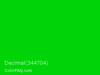 Decimal 344704 Color is a normal green color and the nearest color is Green #00ff00. Hex code #00d408 and RGB value is rgb(0,212,8). In RGB color space, this color is composed of 0% red, 83% green, 3% blue, In CMYK color space, this color is composed of 100% cyan, 0% magenta, 96% yellow , 17% black , In HSL color space, this color has a hue angle of 122° , 100% saturation and 42% lightness.