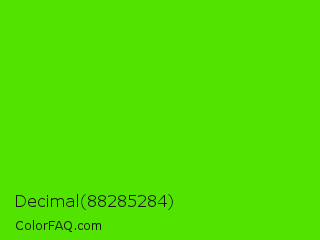 Decimal 88285284 Color is a normal green color and the nearest color is Chlorophyll Green #4aff00. Hex code #52e300 and RGB value is rgb(82,227,0). In RGB color space, this color is composed of 32% red, 89% green, 0% blue, In CMYK color space, this color is composed of 64% cyan, 0% magenta, 100% yellow , 11% black , In HSL color space, this color has a hue angle of 98° , 100% saturation and 45% lightness.