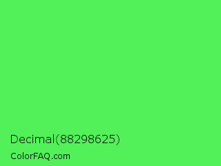 Decimal 88298625 Color is a light green color and the nearest color is Screamin Green #66ff66. Hex code #52f059 and RGB value is rgb(82,240,89). In RGB color space, this color is composed of 32% red, 94% green, 35% blue, In CMYK color space, this color is composed of 66% cyan, 0% magenta, 63% yellow , 6% black , In HSL color space, this color has a hue angle of 123° , 84% saturation and 63% lightness.