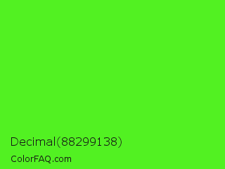 Decimal 88299138 Color is a normal green color and the nearest color is Neon Green #39ff14. Hex code #52f122 and RGB value is rgb(82,241,34). In RGB color space, this color is composed of 32% red, 95% green, 13% blue, In CMYK color space, this color is composed of 66% cyan, 0% magenta, 86% yellow , 5% black , In HSL color space, this color has a hue angle of 106° , 88% saturation and 54% lightness.