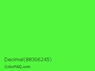 Decimal 88306245 Color is a normal green color and the nearest color is Screamin Green #66ff66. Hex code #52f73d and RGB value is rgb(82,247,61). In RGB color space, this color is composed of 32% red, 97% green, 24% blue, In CMYK color space, this color is composed of 67% cyan, 0% magenta, 75% yellow , 3% black , In HSL color space, this color has a hue angle of 113° , 92% saturation and 60% lightness.